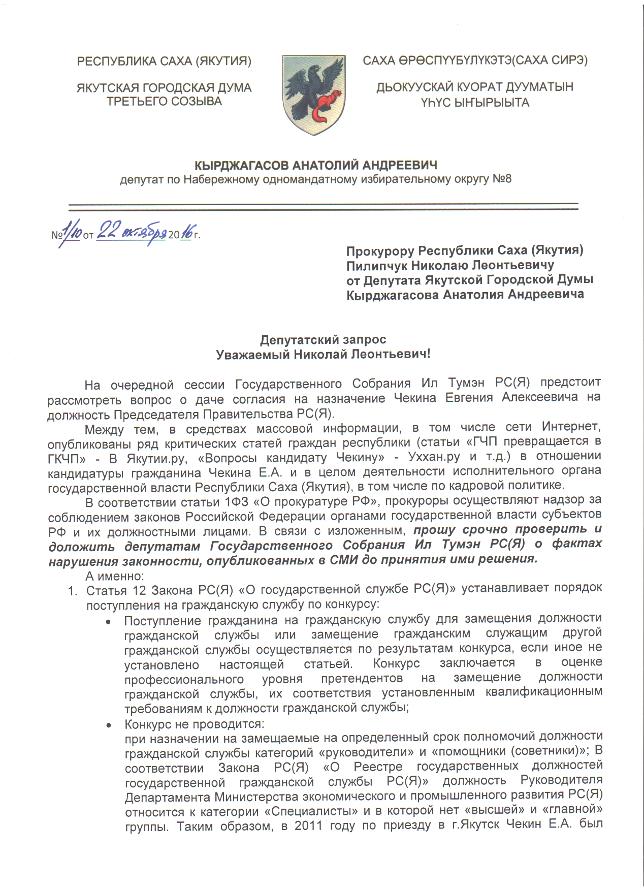 Говоря об этом, депутат просит прокуратуру провести проверку по изложенным в данных статьях фактам и просит дать ответ на вопрос, законно ли вообще находится на государственной гражданской службе Евгений Чекин, который сегодня выдвинут на пост Председателя Правительства Якутии?
