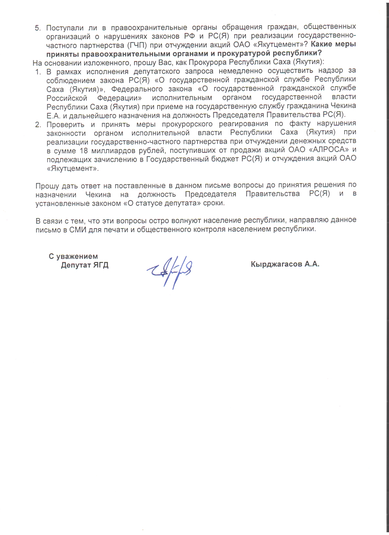 Также в запросе Кырджагасова в адрес нового прокурора Якутии задается вопрос о том, "поступали ли в правоохранительные органы обращения граждан, общественных организаций антикоррупционных организаций о нарушениях статьи 93.1 БК РФ при использовании 18 миллиардов рублей, полученных от продажи 7% акций ОАО "АЛРОСА"? Какие меры приняты правоохранительными органами прокуратурой республики?"