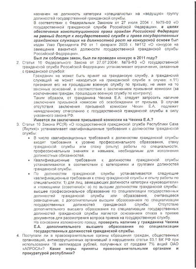 В связи с тем, что "отсутствие дополнительного высшего образования по специализации государственных должностей государственной службы является основанием отказа в приеме документов для рассмотрения вопроса приема на государственную службу", депутат Гордумы Анатолий Кырджагасов просит Прокуратуру РС(Я) проверить наличие у гражданина Чекина Е.А. дополнительного высшего образования по специализации государственных должностей гражданской службы.