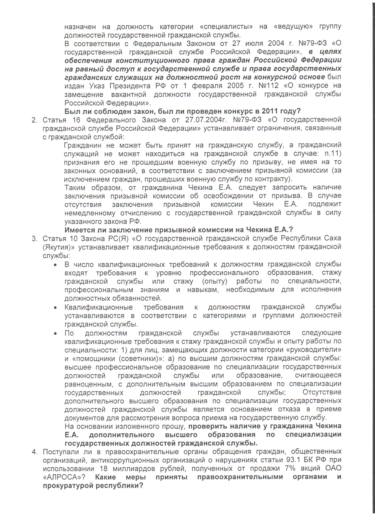 В связи с тем, что "отсутствие дополнительного высшего образования по специализации государственных должностей государственной службы является основанием отказа в приеме документов для рассмотрения вопроса приема на государственную службу", депутат Гордумы Анатолий Кырджагасов просит Прокуратуру РС(Я) проверить наличие у гражданина Чекина Е.А. дополнительного высшего образования по специализации государственных должностей гражданской службы.