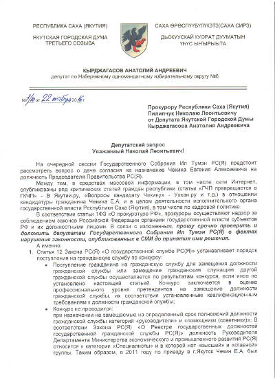 "В средствах массовой информации, в том числе сети Интернет, опубликован ряд критических статей граждан в отношении кандидатуры гражданина Чекина Е.А. и в целом деятельности исполнительного органа государственной власти Республики Саха (Якутия). Смотрите на сайте "В Якутии.ру" статью "ГЧП превращается в "ГКЧП"", на сайте "Uhhan" статью "Вопросы кандидату Чекину" и т.д.", - начинается запрос депутата Кырджагасова.